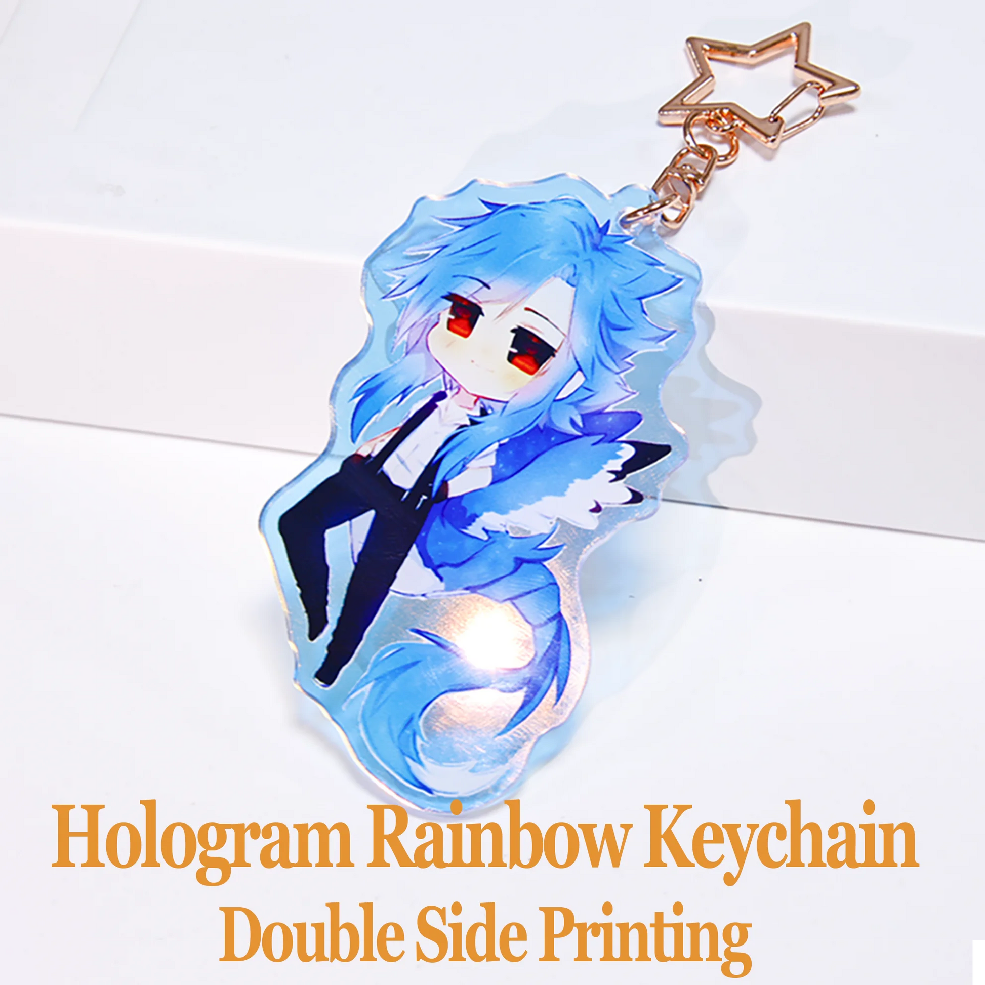 Our custom acrylic keychains are crafted with vibrant HD printing and available in various finishes including clear, glitter, holographic, and epoxy. Choose your preferred size, accessory style (stars, hearts, loops, etc.), and even different designs on each side!